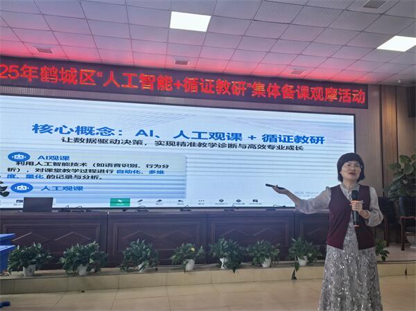 最后,鹤城区教育教学研究部部长蒋海燕以“AI+人工观课:赋能集体备课的循证教研新模式”为主题开展培训与活动总结。她围绕“人工智能+循证教研”的未来发展方向及实践中的注意事项进行解读,进一步强化教师们的技术应用意识与循证教研理念,强调后续鹤城区将持续推进“AI+教研”模式落地,通过常态化培训与交流,助力全区教育质量再上新台阶。