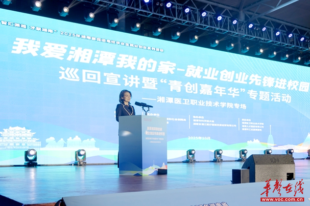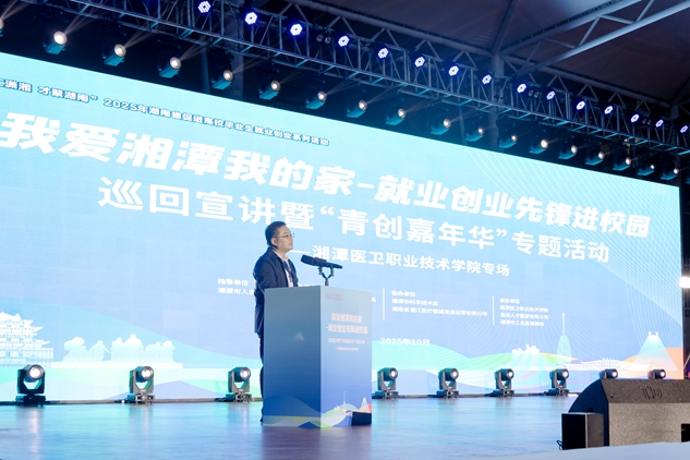 华声在线10月16日讯(通讯员 马良)10月14日晚,“我爱湘潭我的家——就业创业先锋进校园”巡回宣讲暨“青创嘉年华”专题活动在湘潭医卫职业技术学院举行。湘潭市人民政府副市长陈若杨讲话并宣布活动启动,湘潭医卫职院党委书记夏桢致欢迎辞。湘潭市人社局党组书记、局长阳涛,全国人大代表、湘潭宏大真空技术股份有限公司总经理黄乐,湘潭人才集团有限公司党委书记、董事长龙国良以及市就业服务中心、市人力资源服务中心、团市委、市科技局等相关人员,湘潭医卫职院党委委员、副校长成强、刘勇以及党政办、宣传统战部、团委、学工处、招就处、基建后勤处、保卫处负责人,各二级学院党总支书记、副书记、学生科长等3000余名师生共同参加了本次活动。