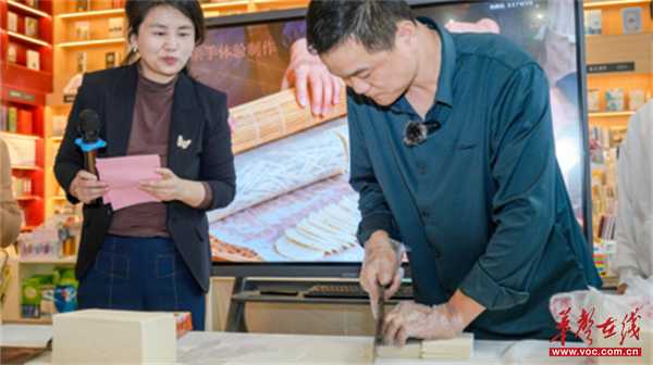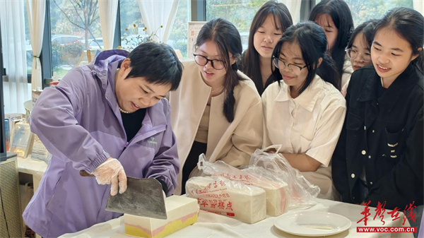 随着湘潭新华斋食品有限公司省级非遗传承人胡军老师的登场,活动迎来高潮。作为灯芯糕制作技艺的第四代传承人,拥有二十余年技艺积淀的胡军以《非遗薪火——湘潭灯芯糕的魅力》为题,从湘潭民谣切入,将这项传承四百年的技艺娓娓道来。他详细讲解了从选料、磨粉、制糖到成型的核心工序,最终化作“色泽洁白、纤细如灯芯”的珍品。胡军老师说一盏灯芯,燃四百年不灭薪火;一缕书香,传湖湘人文化根脉。从齐白石笔下的大写意到灯芯糕手中的细功夫,从桑植民歌的悠扬旋律到非遗技艺的匠心传承,这正是“心忧天下、敢为人先、经世致用、坚韧不拔”的湖湘精神在文化领域的生动写照。如今湘潭灯芯糕已远销海外地区,非遗成为湖湘文化精神跨国文化交流的纽带,这正是湖湘文化“经世致用”精神的当代实践。