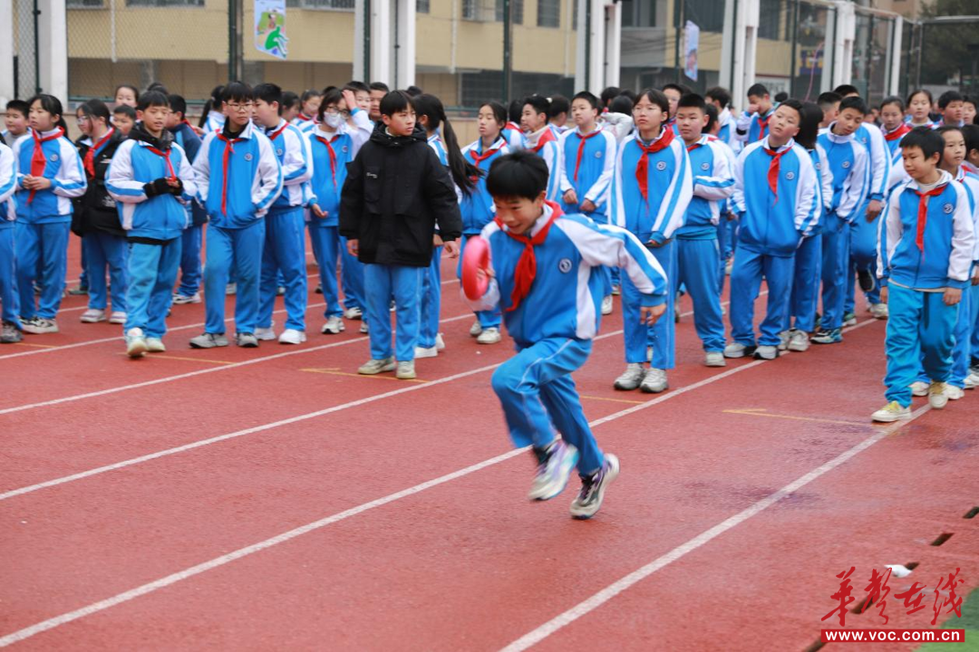 在热身环节,数百名学生齐挥彩旗,绸缎翻飞如跃动的火焰,尽显蓬勃朝气。随后的跑操将活动推向高潮:师生方阵步伐整齐、口号响亮,“文明乐学,进取创新”的呼喊声响彻校园。奔跑的身影与呼出的白气交织,勾勒出冬日校园最具活力的图景。