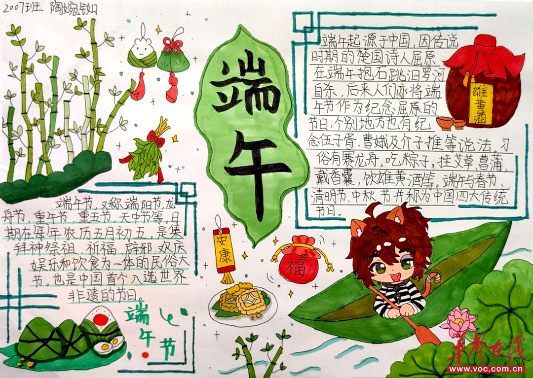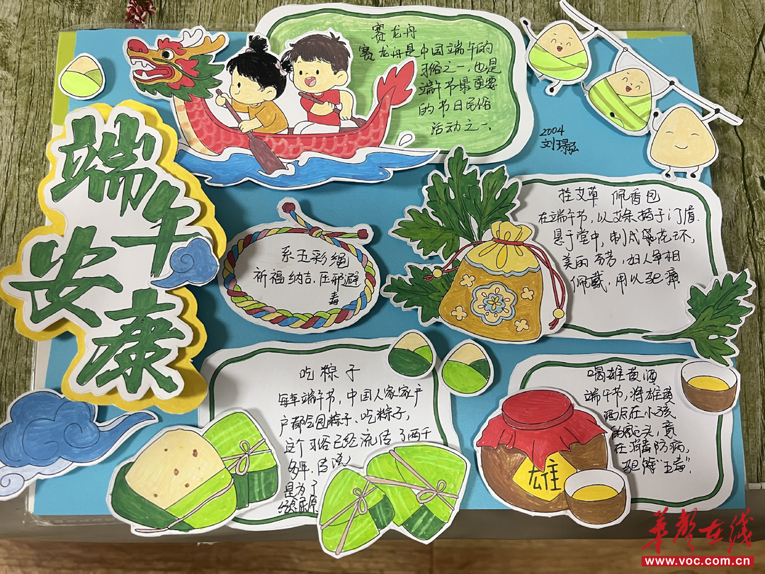 探秘家乡端午俗:图文记录文化传承。5-6年级的同学们通过采访长辈、查阅资料等方式,深入了解了家乡独特的端午习俗,并制作了图文并茂的“端午习俗卡”。从龙舟赛到挂艾草,从雄黄酒到香囊佩戴,每一张习俗卡都凝聚了同学们的调查成果和手绘创意,展现了他们对传统文化的探索精神。