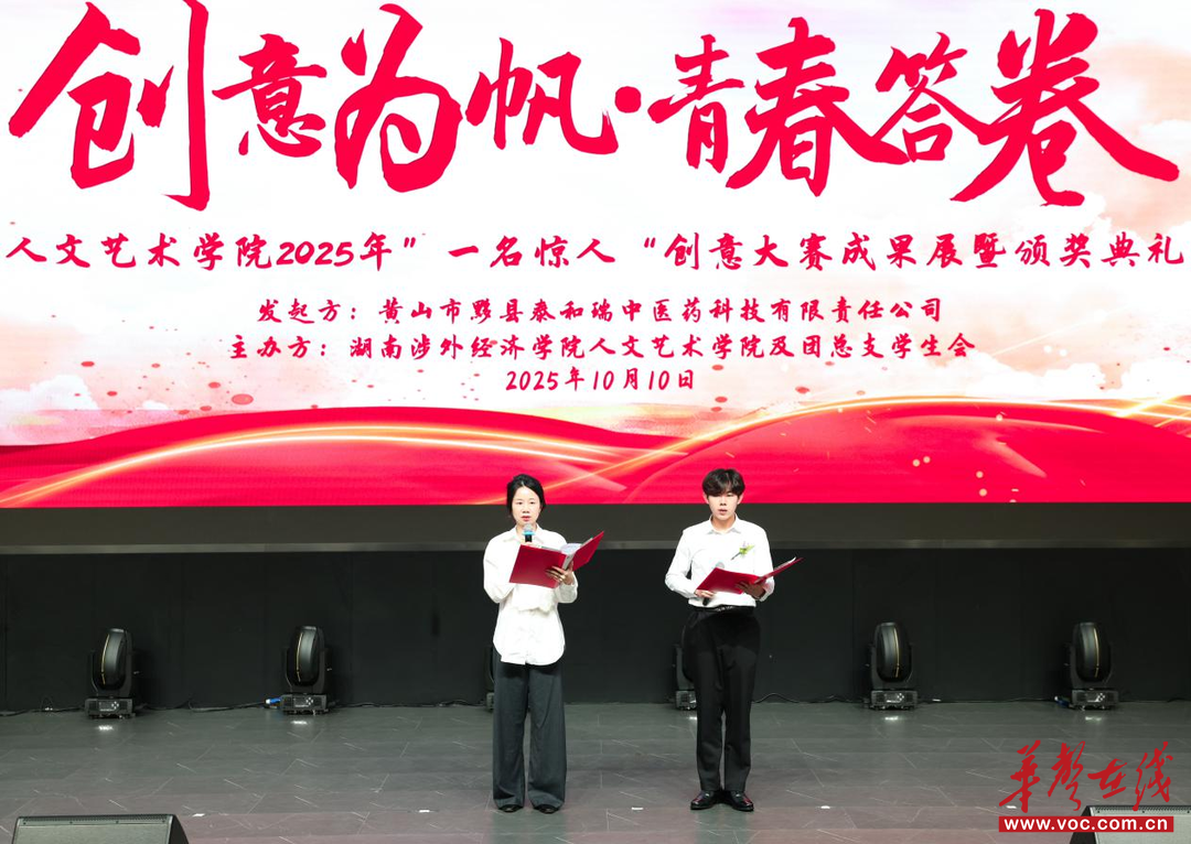 华声在线10月16日讯(通讯员 龚钰婷 李倩 供图 康秭诚 李仕午)近日,湖南涉外经济学院人文艺术学院与黄山市黟县泰和瑞中医药科技有限责任公司联合举办的“创意为帆·青春答卷”2025年“一名惊人”创意大赛成果展暨颁奖典礼在该校世纪讲堂圆满落幕。活动集中展示了校企协同育人的创新实践成果,是该校深化产教融合、推动应用型人才培养的生动范例。