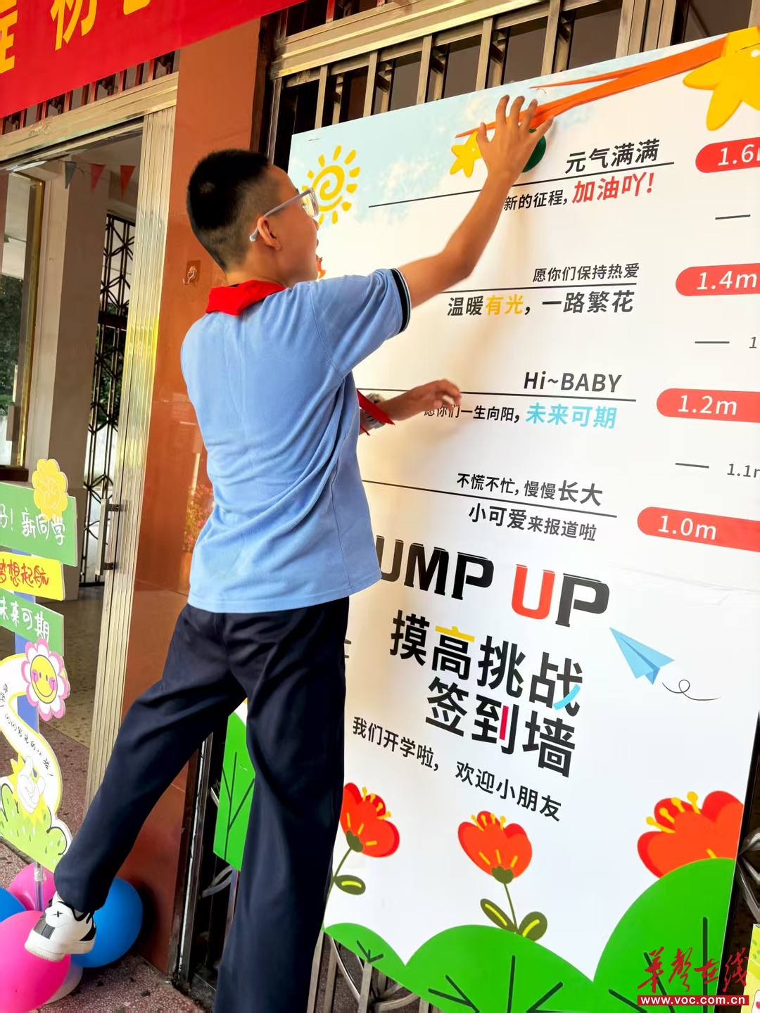 快来,写下你的名字,进行“摸高挑战”吧!瞧,他们奋力一跃,指尖触碰着代表成长与进步的刻度!