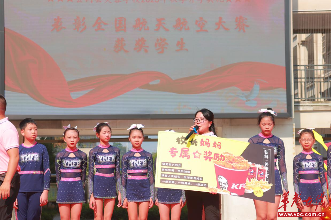 校长唐少清在致辞中以“思政开学第一课”的形式,串联1945年抗战历史与新时代责任传承,向全体师生提出“做历史的铭记者、当下的实践者、未来的开创者”的殷切期望。现场还展示了学校“怡美教育”特色成果,YMFR啦啦操队活力登场,用动感的舞姿展现师生蓬勃向上的精神风貌;学校对优秀教师、学习标兵及优秀班集体进行表彰,并对荣获国家级比赛冠军的啦啦操队员们和全国科技竞赛的队员送出“校长妈妈的专属奖励”,传递出新时代少年接力使命、奋发向上的决心。