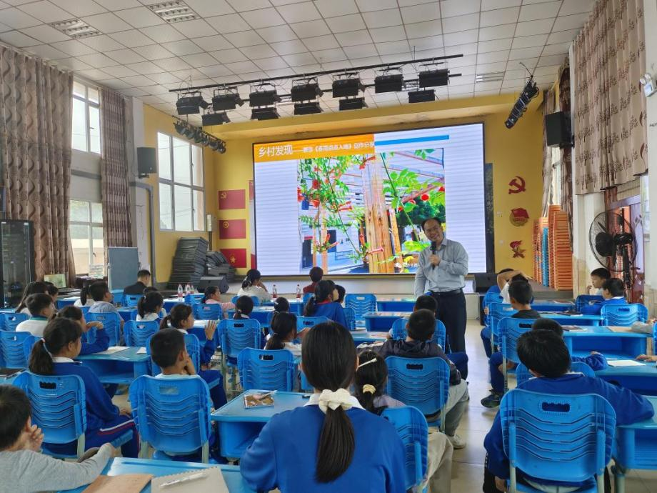 此次系列讲座以杨松林的《乡村发现》主题讲座顺利收官。杨松林既是作家,也是一名中小学高级教师,曾经在跳马镇支教两年,写下日记体散文集《春雨点点入地》。这次,他携新书来到跳马镇大讲堂,为现场小读者分享支教的那些温暖与感动,讲述新书创作背后的故事,告诉孩子们在生活中要多观察、多阅读、勤思考、勤练笔,让乡村生活成为写作的源泉。