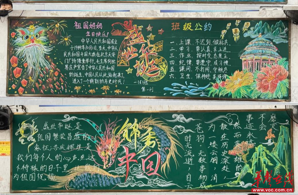 华声在线9月30日讯(通讯员 米雪艳)为庆祝中华人民共和国成立76周年,弘扬爱国主义精神,厚植家国情怀,近日,辰溪县黄溪口镇中心小学组织开展了以“喜迎国庆,强国有我”为主题的班级黑板报创作活动。全校师生以粉笔为媒,以方寸黑板为画卷,共同描绘出一幅幅绚丽多彩的盛世华章,为校园增添了一道道亮丽的风景线。
