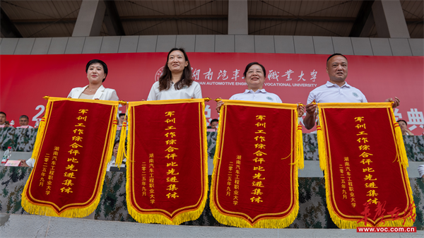 校党委委员、副校长刘平国宣读了2025级新生军训工作各类先进表彰决定。校领导和各二级学院领导分别为军训获奖先进集体和个人颁发了锦旗和荣誉证书。其中,车辆工程学院、车辆运用学院、机电工程学院、军士教育学院4个二级学院获评“军训工作综合评比先进集体”。