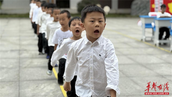 现场常规展示中,一年级各班在班主任、音乐老师、体育老师带领下,依次完成课堂常规、国歌演唱、队列队形展示。