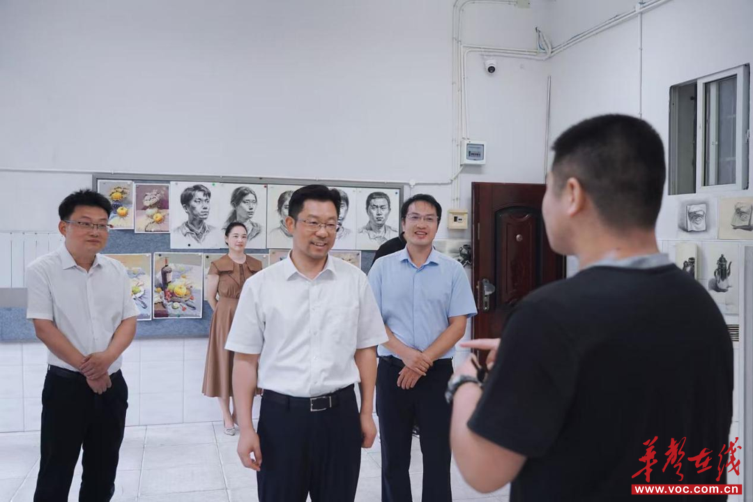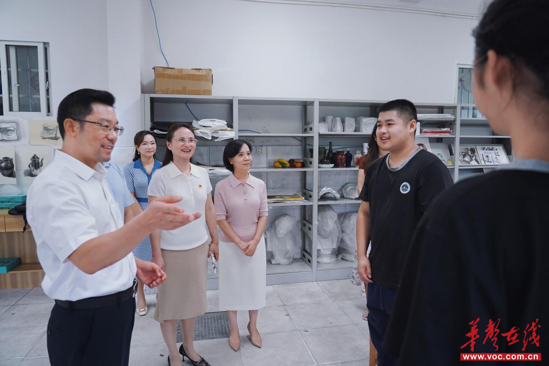 在学校益音楼美术室,贺遵庆与正在备战高考的聋部高二学子亲切交流,认真欣赏孩子们的绘画作品,详细询问升学愿景与家庭情况,赠送孩子们画板、颜料,并协同民政、妇联、教育等部门,为学生拓宽资助渠道,提供精准帮扶与关爱,助力学生逐梦远航。