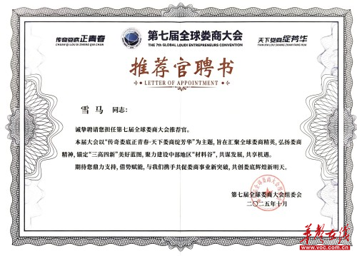 10月13日上午,第七届全球娄商大会组委会正式聘请雪马担任第七届全球娄商大会推荐官。据了解,由娄底市委、娄底市人民政府主办的第七届全球娄商大会将于2025年10月17日—18日在娄底华天大酒店举行。大会以“传奇娄底正青春,天下娄商绽芳华”为主题,汇聚全球娄商精英,进一步弘扬娄商精神,锚定“三高四新”美好蓝图,聚力建设中部地区“材料谷”,共谋发展大计,共享时代机遇。