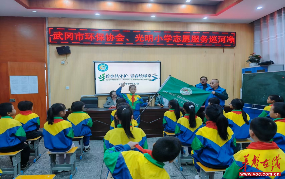 在激昂的乐曲中,授旗仪式将活动推向高潮。武冈市环保协会会长彭平元将沉甸甸的“光明小学环保志愿队”队旗授予学生代表。这面旗帜的传递,是责任,是荣誉,更是“党建带队建”机制下,组织力量与社会资源的一次成功整合。