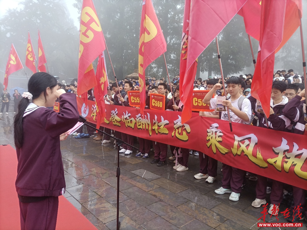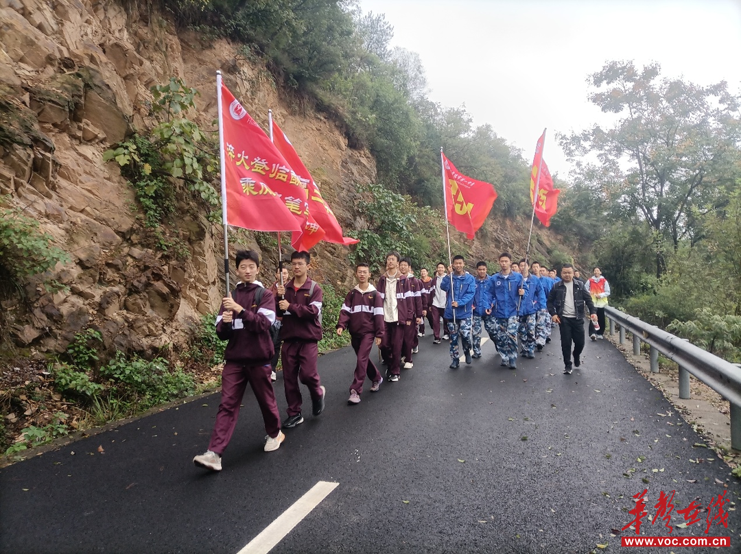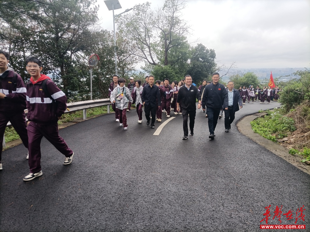 登山起点樱花楼前,学校党委副书记、校长杨井岗为高三年级授旗,党委委员、副校长杨贤琼等为各班授旗。
