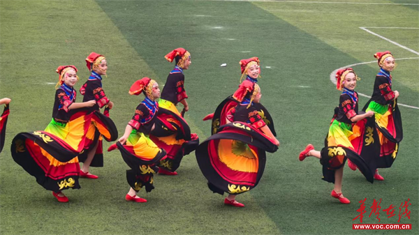 学校啦啦操社团带来的压轴表演《欢乐火把节》,瞬间将现场气氛推向沸腾。队员们身着绚丽彝族服饰,头戴银饰,踏着欢快的羊皮鼓点翩然起舞:裙摆飞扬如跃动火焰,灵动转身似蝴蝶穿花,整齐划一的动作中满是节日欢腾。这支曾斩获全国啦啦操比赛一等奖的 “明星队伍”,再次以精湛技艺绽放光芒,台下掌声、欢呼声经久不息。