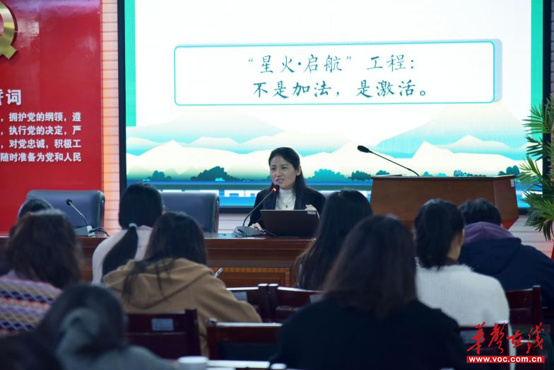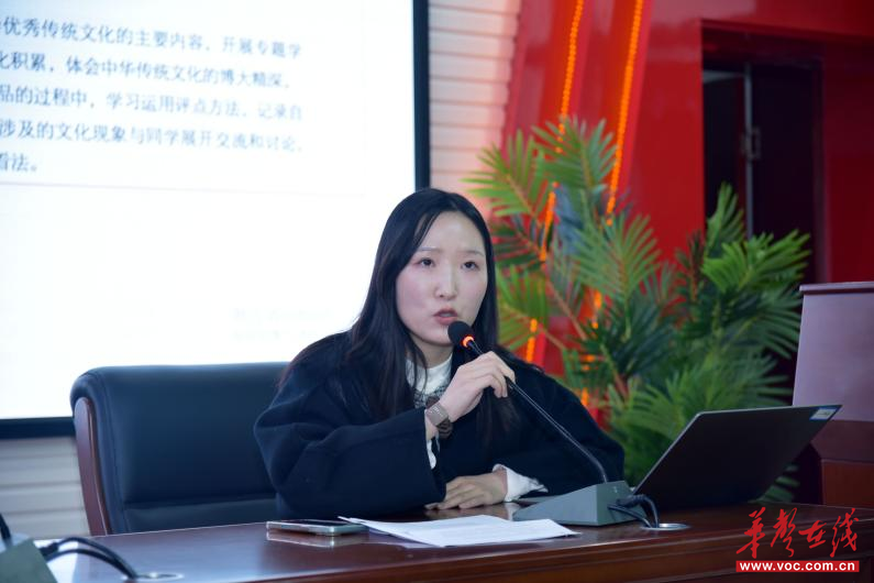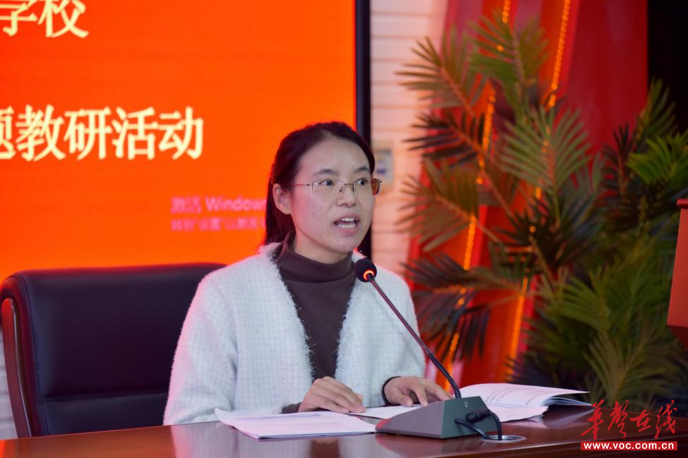 随后,望城区职业中等专业学校语文教研组组长邱琼分享了学校语文教研活动的开展经验。她以“语启智慧,言思共行”为主题,介绍了以“星火·启航工程”为核心的系列活动,包括汉字听写、诗词大会、辩论赛等,通过三级赛制推动全员参与,促进师生共同成长。