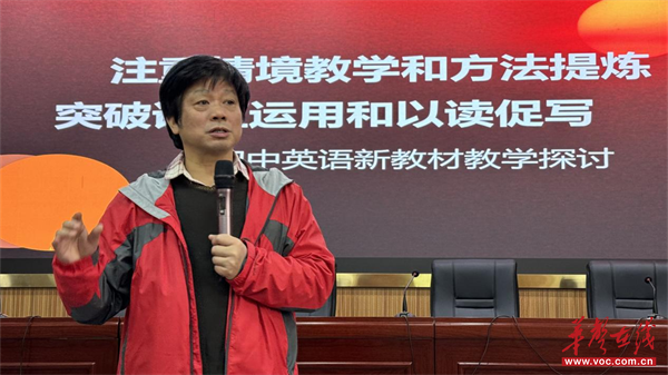 上午,株洲教科院张光明老师以《注重情境教学和方法提炼,突破词汇运用和以读促写》为主题开展讲座。张光明结合实例说明,情境教学需融教材、课堂于真实场景,可借多拟态语篇等构建;词汇教学结合生活、构词法等,落实语境运用与读写整合。张老师风趣幽默的语言,渊博的知识使上午的学习充满了欢声笑语。
