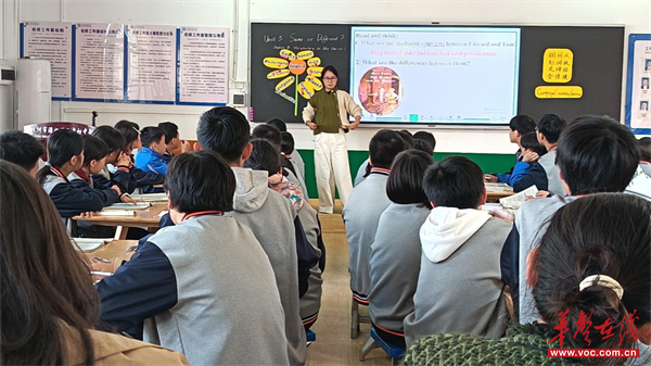五中初中部晏丽娟老师进行八年级上册《Unit3 Same or Different?》词汇应用课例展示,课堂新意十足。“Engage引入”环节,师生齐唱《My friend》,英文韵律裹挟优美文字,新单词随歌声自然渗透,瞬间点燃课堂氛围。创意板书更见巧思:以“friend”为花心,环绕“direct(率直)、honest(诚实)”等9个词汇作花瓣,将抽象单词转化为直观图形,让学习更鲜活。
