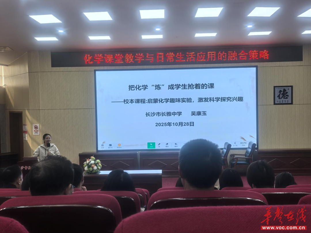 下午的评课与分享环节同样精彩纷呈。长雅中学梁帅老师、桃源县朱霞飞老师分别对两节异构课进行专业点评,从教学目标、课堂设计、素养落实等维度深入剖析,让在场教师深受启发。随后,长雅中学教研团队继续分享实践经验:梁帅老师深化讲解化学生活化教学策略,高莉老师介绍初中化学家庭小实验的探索成果,吴康玉老师展示校本课程《启蒙化学趣味实验》的开发与实践,多维度呈现了该校化学教学的创新实践与扎实功底。