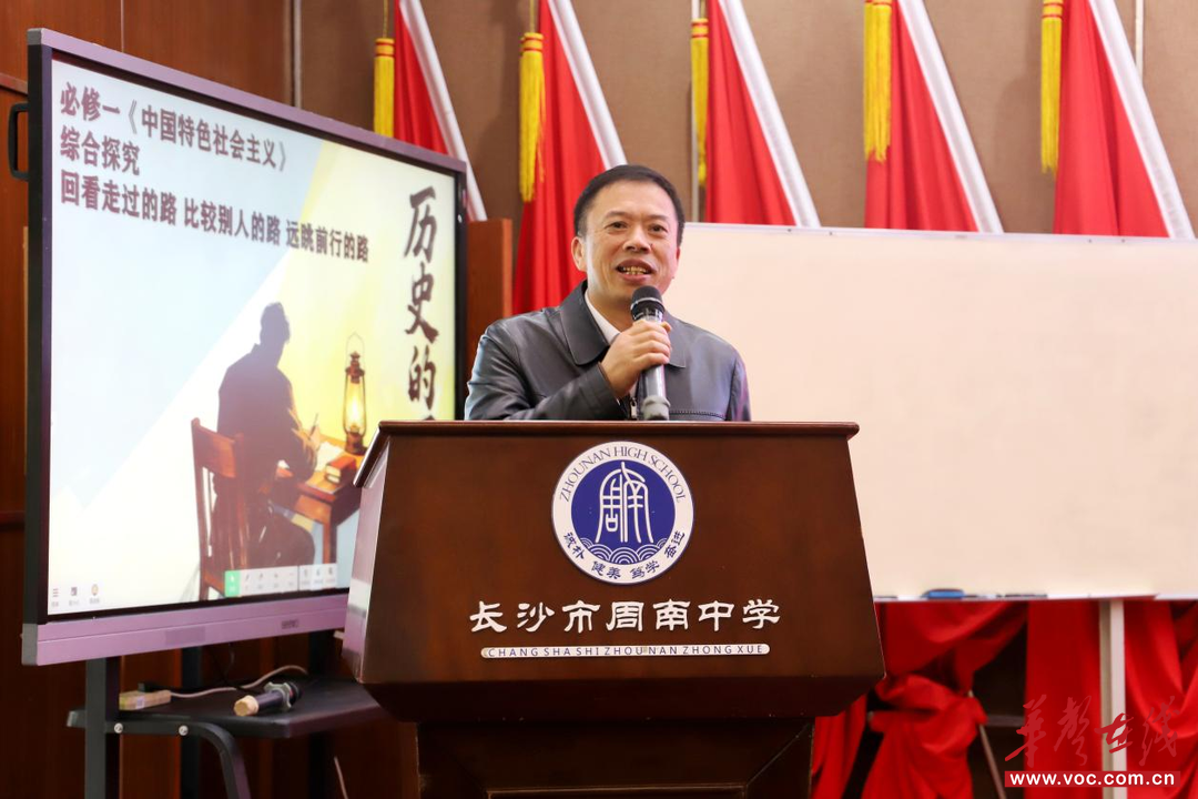 长沙市教科院副院长、中学政治教研员袁苍松表示,本次研讨活动紧扣“创新课堂教学,提升思政课引领力”主题,是推动思政课改革向纵深发展的重要举措。他充分肯定周南中学作为百年名校在思政教育领域进行的持续探索与取得的显著成效,赞赏学校将红色基因融入思政课堂的实践智慧。面向未来,他希望全市思政教师以核心素养为导向,深化教学改革创新,努力打造具有长沙特色、体现时代要求的思政课。