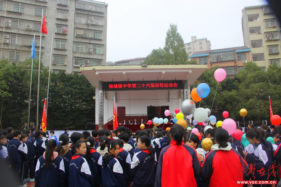 最后,党支部书记、校长喻彦平郑重宣布:梅城镇中学第二十六届运动会正式开幕!,现场瞬间沸腾。掌声、欢呼声、哨声交织在一起,彩色气球腾空而起,整个操场变成了欢乐的海洋。