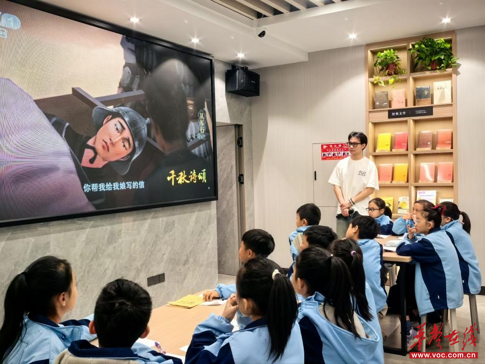 活动现场,新华书店的邓皓元老师以唐代边塞诗《从军行》为切入点,带领孩子们穿越千年时光。“这首诗里藏着将士们的家国情怀,大家试着想象边疆的壮阔景象,感受诗句的铿锵气势。” 邓皓元结合历史背景娓娓道来,通过逐句解析、节奏朗读、情感共鸣等方式,让孩子们在抑扬顿挫中体会古典诗词的韵律之美,在千古佳句中汲取精神力量。同学们坐姿端正、眼神专注,时而跟读吟诵,时而举手提问,沉浸式的诗词课堂让传统文化的种子悄然萌芽。