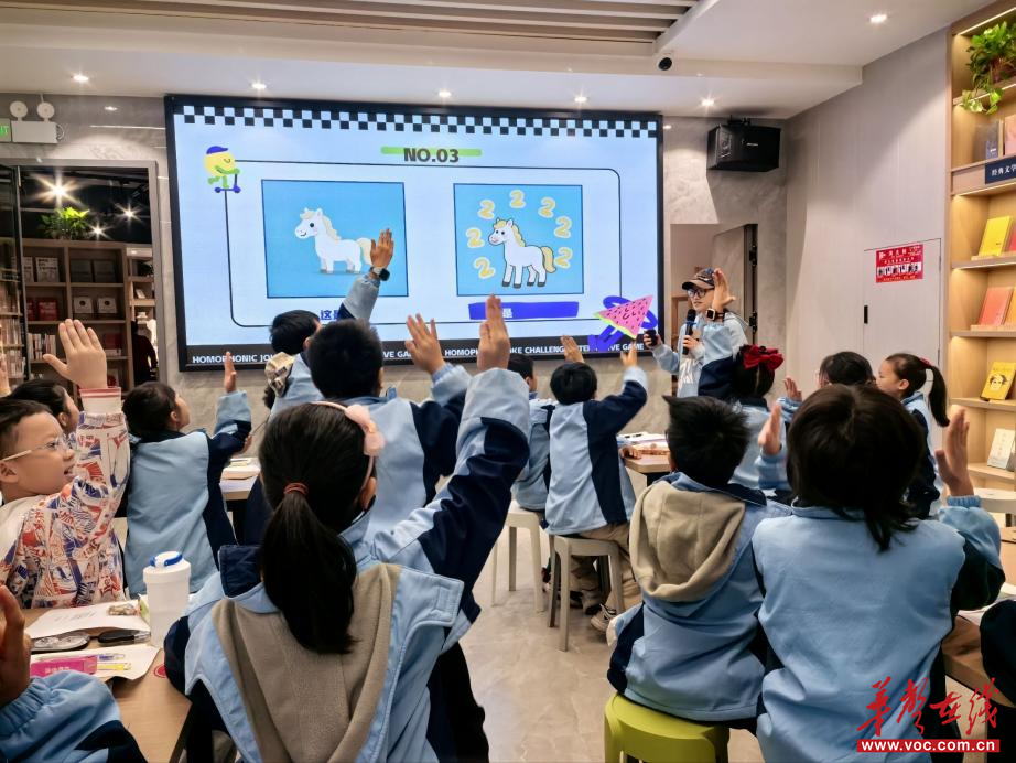 紧张的诗词学习后,刘妍祯老师带来的《谐音梗大挑战》让现场氛围瞬间轻松活泼。“这是马,这是什么?”“二维码!”一系列趣味谐音谜题接连抛出,孩子们争先恐后举手抢答,书店里充满欢声笑语。“这样的游戏太有趣了,不仅能放松心情,还能发现语言的奇妙之处!” 一位同学兴奋地说。刘妍祯表示,趣味互动旨在缓解阅读疲劳,让孩子们在玩乐中感受语言魅力,激发主动探索的兴趣。