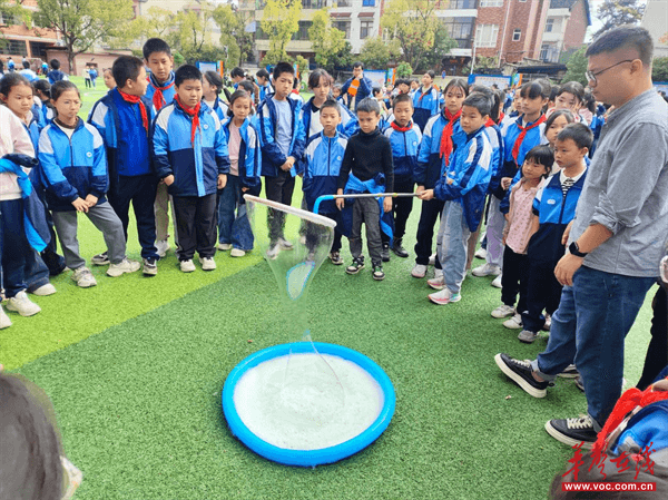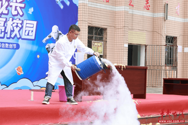 科技表演环节堪称“科学知识的可视化课堂”:空气炮喷出清晰可见的环形气浪,让学生直观观察气流的形态与传播轨迹;“牛气冲天”实验中,双氧水与二氧化锰反应让气球快速膨胀,生动诠释氧气产生原理;液氮倒入热水后形成的“蘑菇云”,让学生在惊叹中认识氮气低温特性;“大象牙膏”实验里,泡沫如瀑布般喷涌,揭开催化剂在化学反应中的作用。一个个生动的实验,让抽象的科学知识变得看得见、摸得着。