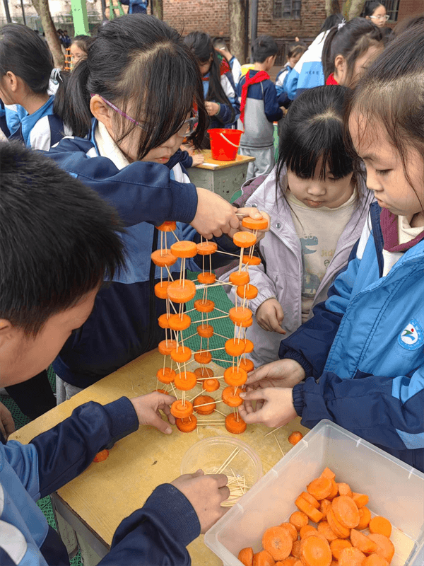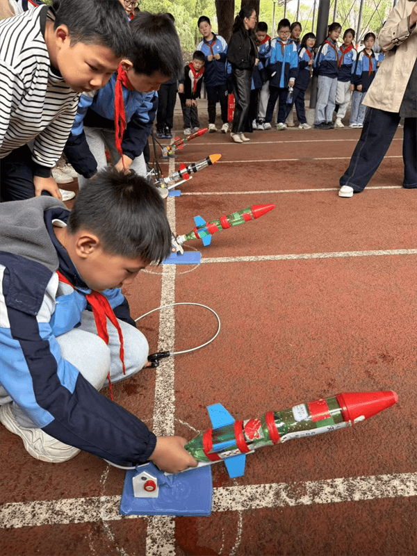 开幕式后,各项比赛与互动体验有序开展,整个校园都化身为学生们的科技竞技场。“自己折的纸飞机飞了5米远!”低年级的小浩举着作品欢呼,大家在纸飞机赛中反复调整角度,摸索空气动力学;中年级学生组队用500克以内胡萝卜和200根以内牙签拼搭承重结构,既要比高度,还得经受轻微震动测试;高年级的水火箭发射现场更热闹,学生们在专家指导下调试尾翼角度,随着“发射”指令,水火箭向前呼啸“出征”,现场欢呼声不断。
