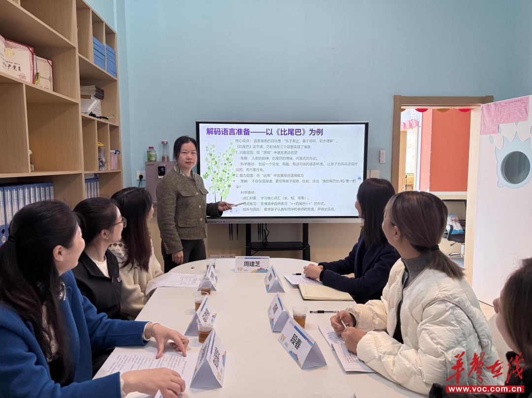 下午,县教育局幼教专干周建芝以《从“两节课”看幼小衔接的科学路径——语言与数学准备能力的培养》为题,结合现场示范课案例,从理念到实操系统讲解。她强调,幼小衔接需聚焦幼儿核心能力培养,语言领域要构建有趣的表达环境,通过情境引导幼儿主动运用语言;科学领域则需注重直观体验与思维启蒙,贴合幼儿认知特点。同时,她还详细分享了“游戏化教学”“生活化渗透”等实用策略,为乡镇教师提供清晰可落地的教学指引。