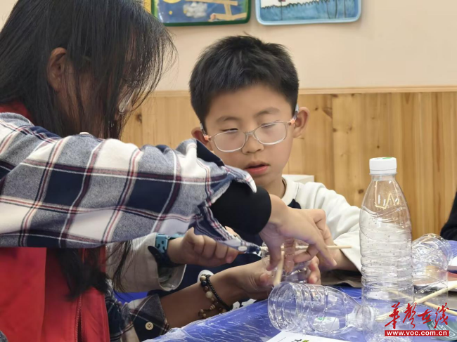 带着对资源利用的新思考,孩子们迎来了“‘筷’乐回收,‘瓶’安行动”主题日。志愿者通过短片直观展示了塑料污染与一次性餐具的浪费问题,并分享了诸多变废为宝的创意案例,瞬间激发了孩子们的创作欲。手工环节里,旧塑料瓶与彩纸组合,变身成清新的收纳盒;一次性筷子经过剪裁和粘贴,组装成小巧的笔筒。“我用饮料瓶做了个小盆栽!”一位小朋友骄傲地展示着自己的作品。原本被视作废弃物的瓶子和筷子,在童心的点化下焕发新生。