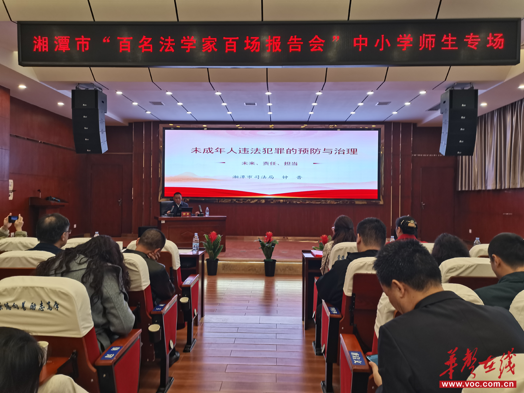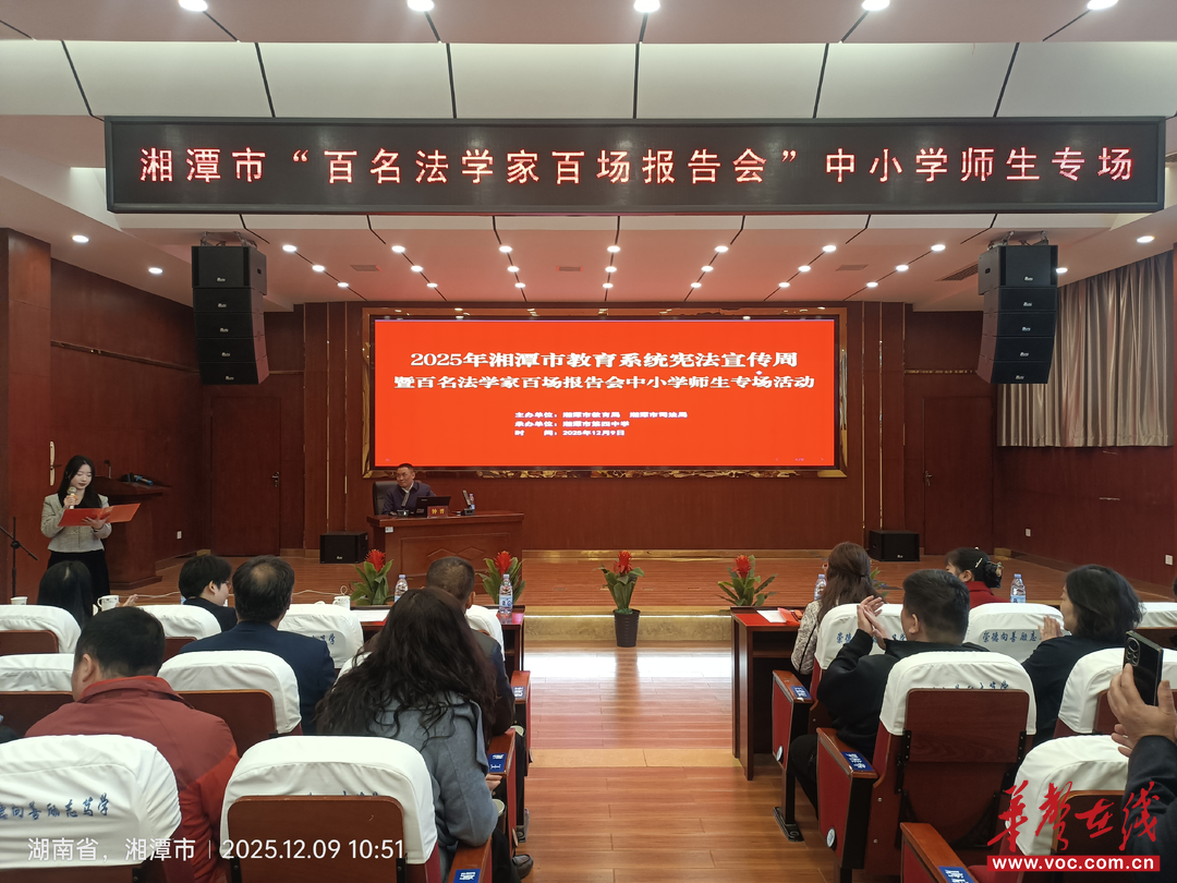 华声在线12月10日讯(通讯员 刘自然)12月9日,2025年湘潭市教育系统宪法宣传周暨百名法学家百场报告会中小学师生专场活动在湘潭市第四中学举行。本次活动由湘潭市教育局、湘潭市司法局联合主办,湘潭市第四中学承办,旨在深化青少年宪法法治教育,营造尊法学法守法用法的校园氛围。