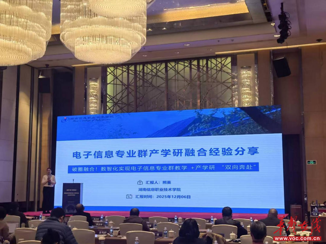 名师工作室教师代表以《破圈融合!数智化实现电子信息专业教学与产学研“双向奔赴”》为题,从名师工作室推动教学创新和专业群建设服务人才培养的双重视角出发,系统介绍了湖南信息职院电子信息工程技术专业群在课程重构、教学模式改革及产学研协同育人等方面的探索路径与初步成效。