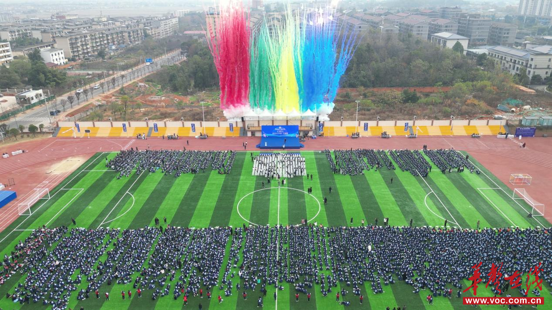 12月16日,科技节开幕式在学校田径场举行。市科技馆、区人社局、区科协等相关部门负责人,区教育局领导、各级学校代表、赫山区朱美香小学科学工作室成员与全校师生齐聚,共同见证盛会启幕。C2417 班付亦辰与 C2418 班陶妙妍组成的双语主持搭档从容串联流程,展现了世通学子的综合素养。三年级舞蹈社团带来的科技主题舞蹈《梦想启航》,用灵动舞姿传递对科学的向往;校长程勇华致辞鼓励同学们以好奇心与行动力探索科技、收获成长。随后,C2516 班罗佳琪分享《少年学 AI》的阅读感悟,坚果实验室的趣味科学实验秀与精彩航模表演点燃现场热情,X2302 班肖一雯的《追科学之光,学匠心精神》主题演讲引发共鸣。最后,校党总支书记王晟珉宣布科技节开幕,彩烟腾空而起,拉开系列活动序幕。