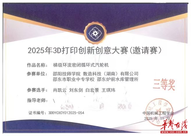 教师队伍建设同样成果斐然。在2025—2026年全国行业职业技能竞赛——第二届全国皮革行业职业技能竞赛(皮具设计师)全国总决赛上,周应平老师与来自全国的140名行业精英同台竞技,最终斩获国赛三等奖,彰显了学校专业教师作为“行家里手”的出色水准。同时,在近期结束的由中国机械工程学会主办的2025年3D打印创新创意大赛(邀请赛)中,学校教师白宏景参与设计的作品《梯级环流密闭循环式汽轮机》荣获大赛三等奖,展现了其在3D打印技术应用与工程创新领域的深厚功底。