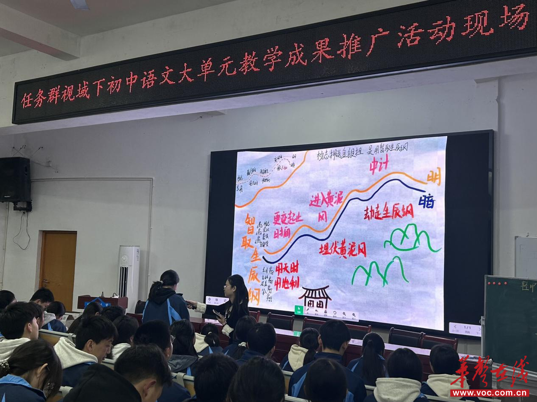 活动现场,四堂示范课各具特色。临武五中教师曹艳执教的《AI赋能,文游共生》,将人工智能与语文实践深度融合,用科技赋能大单元下的实践运用;临武六中教师骆婷以分层思维导图解构《智取生辰纲》,串起大单元教学的任务链;郴州市北湖实验中学教师侯入铭执教的《我的白鸽》、郴州市北湖实验中学教师宋怡丹执教的《回忆我的母亲》,则紧扣大单元主题,通过细节品读与情感共鸣,展现了任务群视域下的课堂深入阅读新样态。