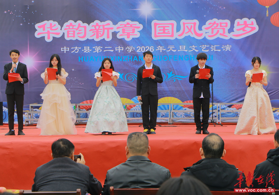 华声在线12月30日讯(通讯员 杨洁)为丰富校园文化生活,展示师生风采,弘扬中华优秀传统文化,12月29日下午,中方县第二中学举办了“华韵新章,国风贺岁”元旦文艺演出。全校师生欢聚一堂,共赏这场融合传统与青春的视听盛宴。