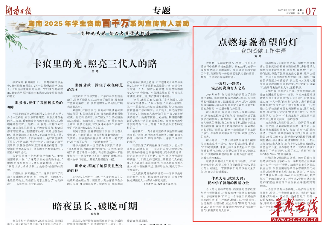 人物简介:黄鹤,中共党员,学生思想政治教育副教授,获省高校“学生工作研究与实践先进个人”、省人社厅“优秀共产党员”、学校“优秀辅导员”称号,指导学生参加省高校大学生思政类活动竞赛获奖18项;主持参与省校级课题15余项,参与编写教材2本,发表专著1部,论文10篇。她撰写的文章《点燃每盏希望的灯——我的资助工作生涯》被湖南日报(2026年1月12日纸质版)专题版面刊载。