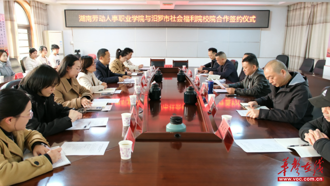 在与会嘉宾的共同见证下,湖南劳动人事职业学院公共管理与服务学院院长姚芳与汨罗市社会福利院院长何平共同签署校院合作协议。双方约定将在实习基地建设、课程开发、技术交流、志愿服务等方面开展多层次合作。
