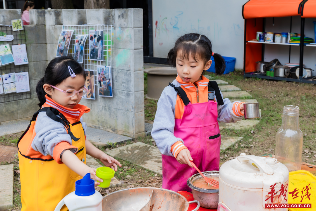 一部分场地被翻整为沙池、泥地,孩子们在沙池中挖渠引水,感知土壤的呼吸;在泥地里种植蔬果,体验耕耘的辛劳与收获的喜悦。在生态菜园里,孩子们亲手播下南瓜、青菜与薄荷的种子,每日观察并记录生长变化,用稚嫩的笔触描绘植物生长日记。