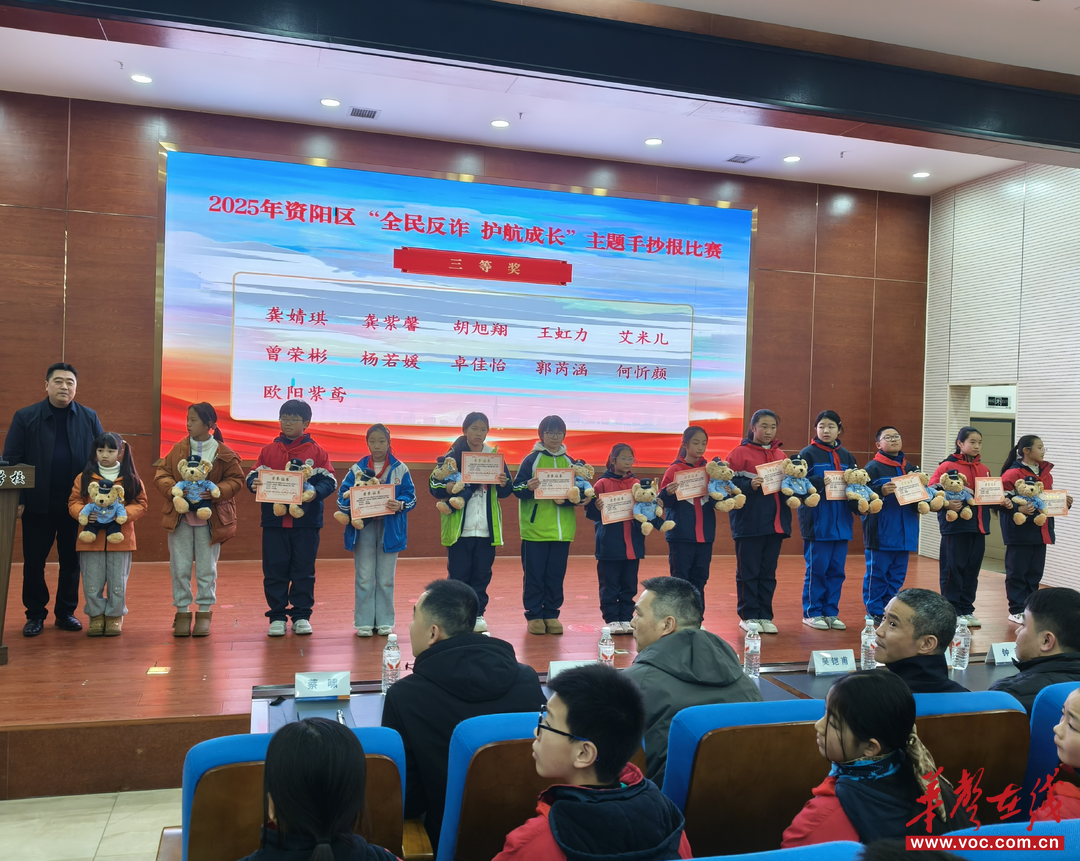 颁奖环节中,获奖学生代表依次上台接受表扬。他们创作的手抄报作品主题鲜明、形式多样、富有创意,以直观的画面和简洁的文字,生动阐释了反诈防骗的关键要点,展现了当代青少年积极参与社会安全教育的主人翁精神。活动期间,资阳区马良学校2406班学生表演了反诈主题节目,以艺术形式传递防骗智慧;获奖学生代表张翊岚分享了创作体会,并号召全体同学认真学习反诈知识,主动成为校园反诈的宣传员和实践者。