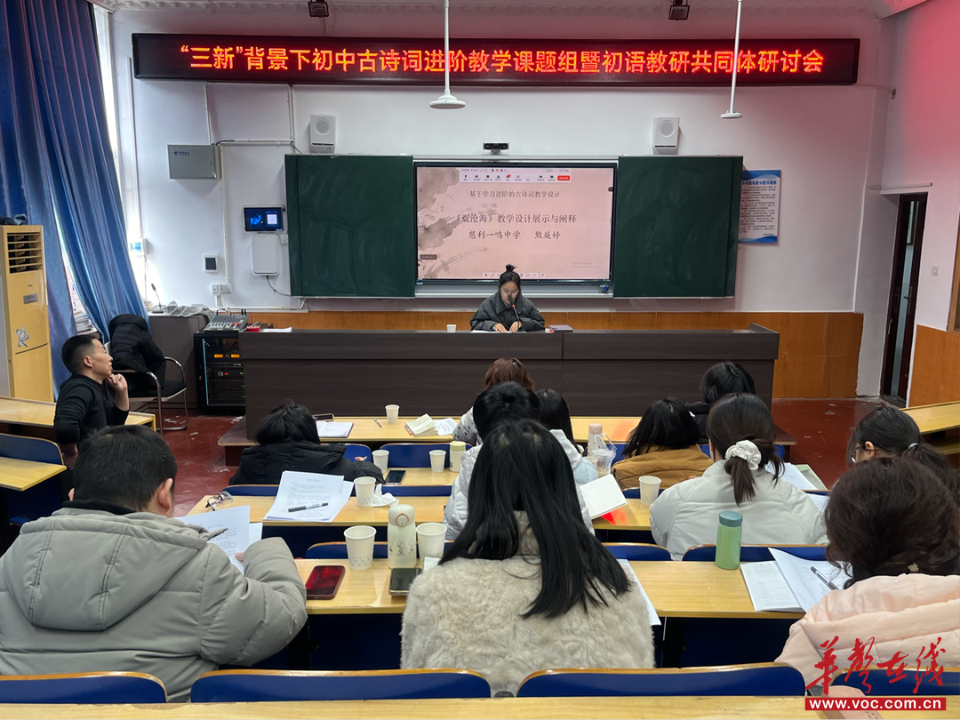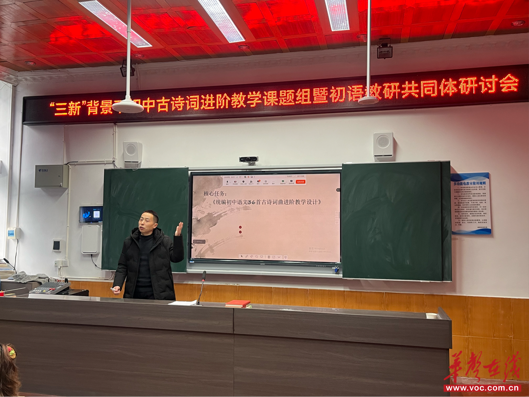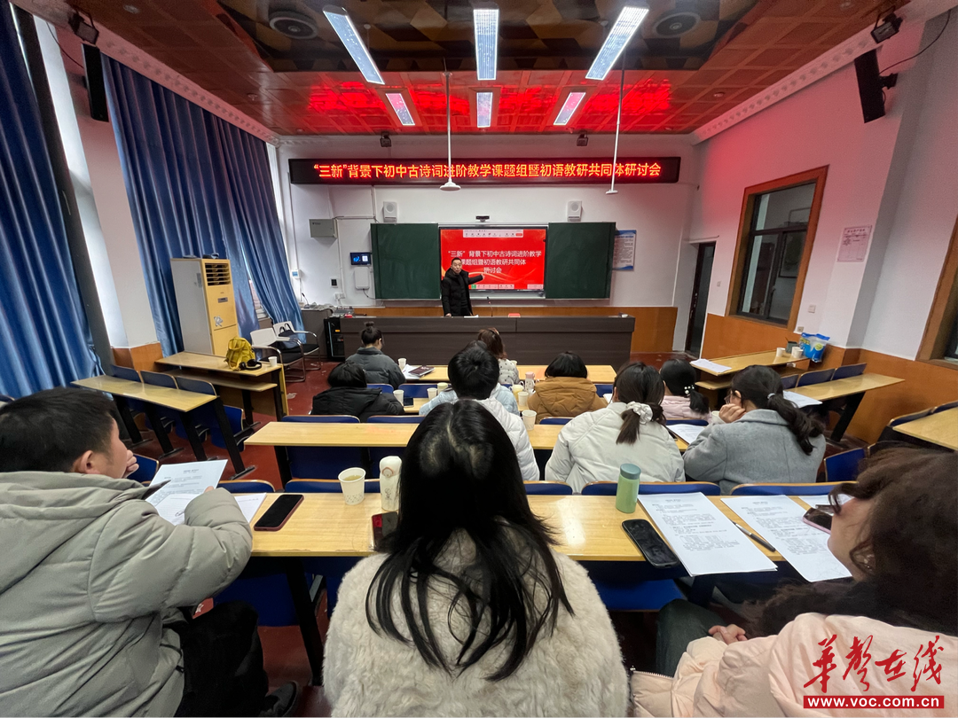 华声在线2月2日讯(通讯员 饶丽)为进一步探索“新课程、新教材、新中考”背景下初中古诗词教学的有效路径,2月2日,桃源县初中语文教研共同体专题研讨会在县文昌中学举行。会上,省教改项目《“三新”背景下初中古诗词进阶教学》项目组面向全县初中语文教师进行了阶段性成果推介。活动采取线下研讨与线上直播相结合的方式,吸引了全县初中语文骨干教师现场参与,同时通过腾讯会议向全县直播,线上观看人数逾百人。