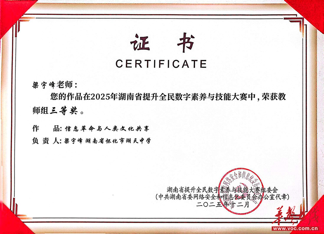 华声在线2月6日讯(通讯员 刘华)近日,2025年湖南省提升全民数字素养与技能大赛评选结果揭晓。怀化市湖天中学教师团队表现突出,梁宇峰、文奇、谌丽霖、张权林、刘娟五位老师荣获教师组三等奖,展现了学校在推进教师数字化能力建设方面的扎实成果。