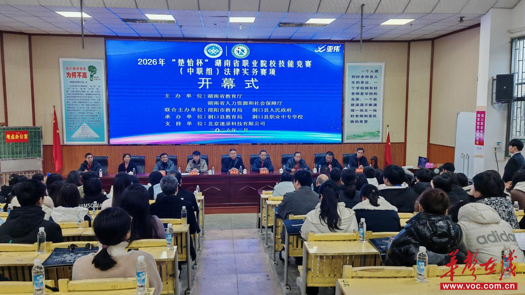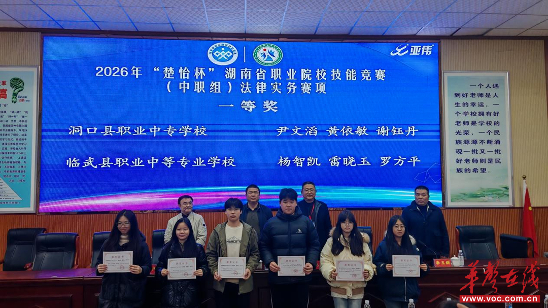 华声在线2月7日讯(通讯员 王海玲)律回春晖,技能逐梦。2月6日,2026年度“楚怡杯”湖南省职业院校技能竞赛中职组公安与司法专业类法律实务赛项在洞口县职业中专学校圆满落幕。本次赛事由湖南省教育厅、湖南省人力资源和社会保障厅主办,邵阳市教育局、洞口县人民政府联合主办,洞口县教育局、洞口县职业中专学校承办。