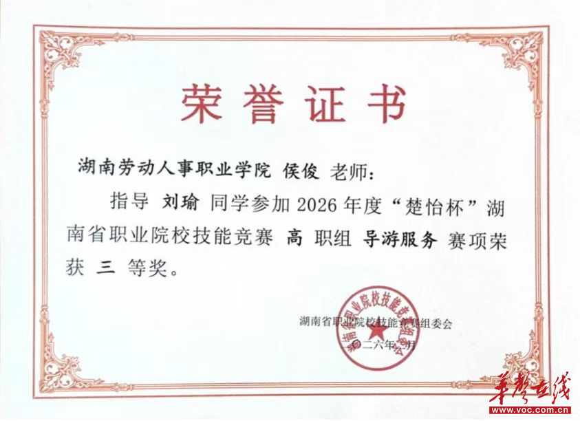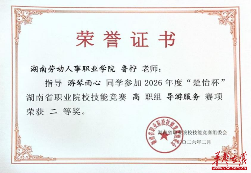 华声在线2月11日讯(通讯员 侯俊)近日,2026年“楚怡杯”湖南省职业院校技能竞赛导游服务赛项在湖南商务职业技术学院圆满落幕。湖南劳动人事职业学院自贸经济与文旅学院选派的三名参赛选手,在赛场上团结拼搏、凭借过硬的专业素养与稳定的临场发挥,实现全员获奖。游琴雨心(指导老师鲁柠)、石涵钰(指导老师金菡)斩获二等奖,刘瑜(指导老师侯俊)荣获三等奖,续写了学院在该赛项中的亮眼佳绩。