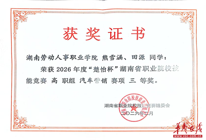 华声在线2月14日讯(通讯员 李恒)近日,2026年度“楚怡杯”湖南省职业院校技能竞赛汽车营销赛项在激烈的角逐中落下帷幕。湖南劳动人事职业学院智能装备制造学院新能源汽车专业学生田源、熊雪涵凭借出色的表现,荣获团体三等奖,为学院增光添彩。