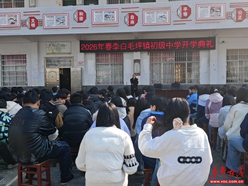 督导检查结束后,白毛坪镇初级中学举行了2026年上学期开学典礼,全体师生精神饱满、队列整齐,责任督学全程观摩指导。