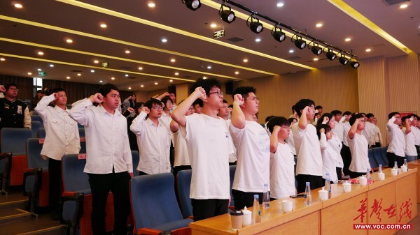 宣讲尾声,宣讲团队与现场大学生共同庄严宣誓:“以吾辈青春,护锦绣山河;以热血担当,慰先烈忠魂。”铿锵誓言回荡在报告厅,并通过网络同步传递到每一个收看班级,将活动氛围推向高潮。