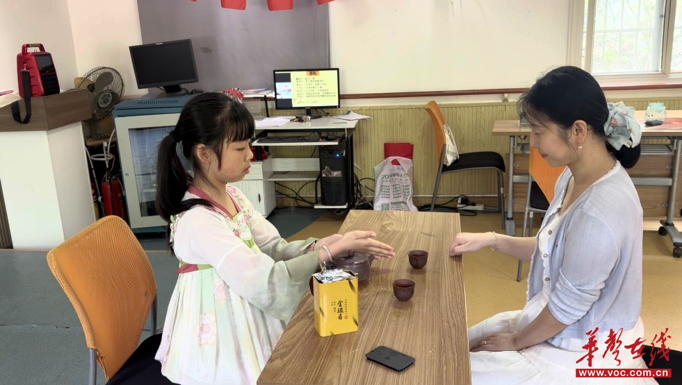 最热闹的是学习茶礼实践活动。“倒茶七分满、奉茶双手递、叩手谢茶礼”,在刘新红、杨艳的示范与指导下,孩子们端起茶杯行礼仪,在一斟一饮间习得“以茶敬人”的传统社交规范,有模有样。